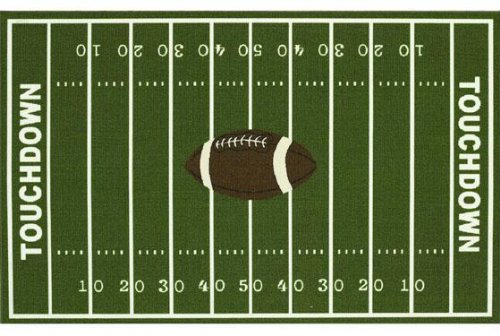 Add a Football Field Novelty Rug for a Fun Look Add a sporty look with this football field rug from our Sportstime Collection. It features a center football surrounded by the layout of a football field.Our synthetic rugs have the quality and look you want. This synthetic machine-made rug is long-lasting and easy to care for. Bring a fun touch to your family room or child's room. You should order this rug today.. Actual size is 4'11"x7'